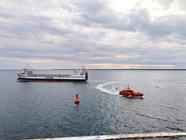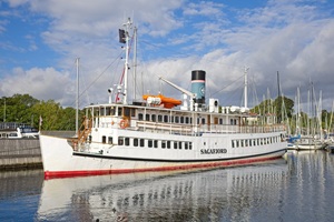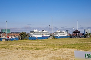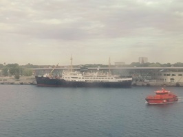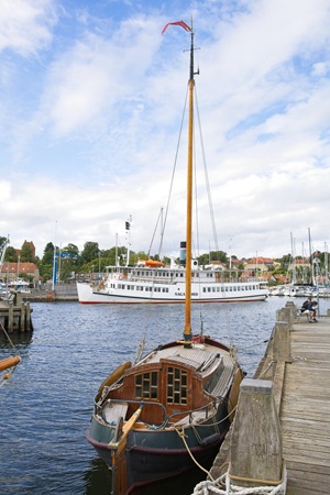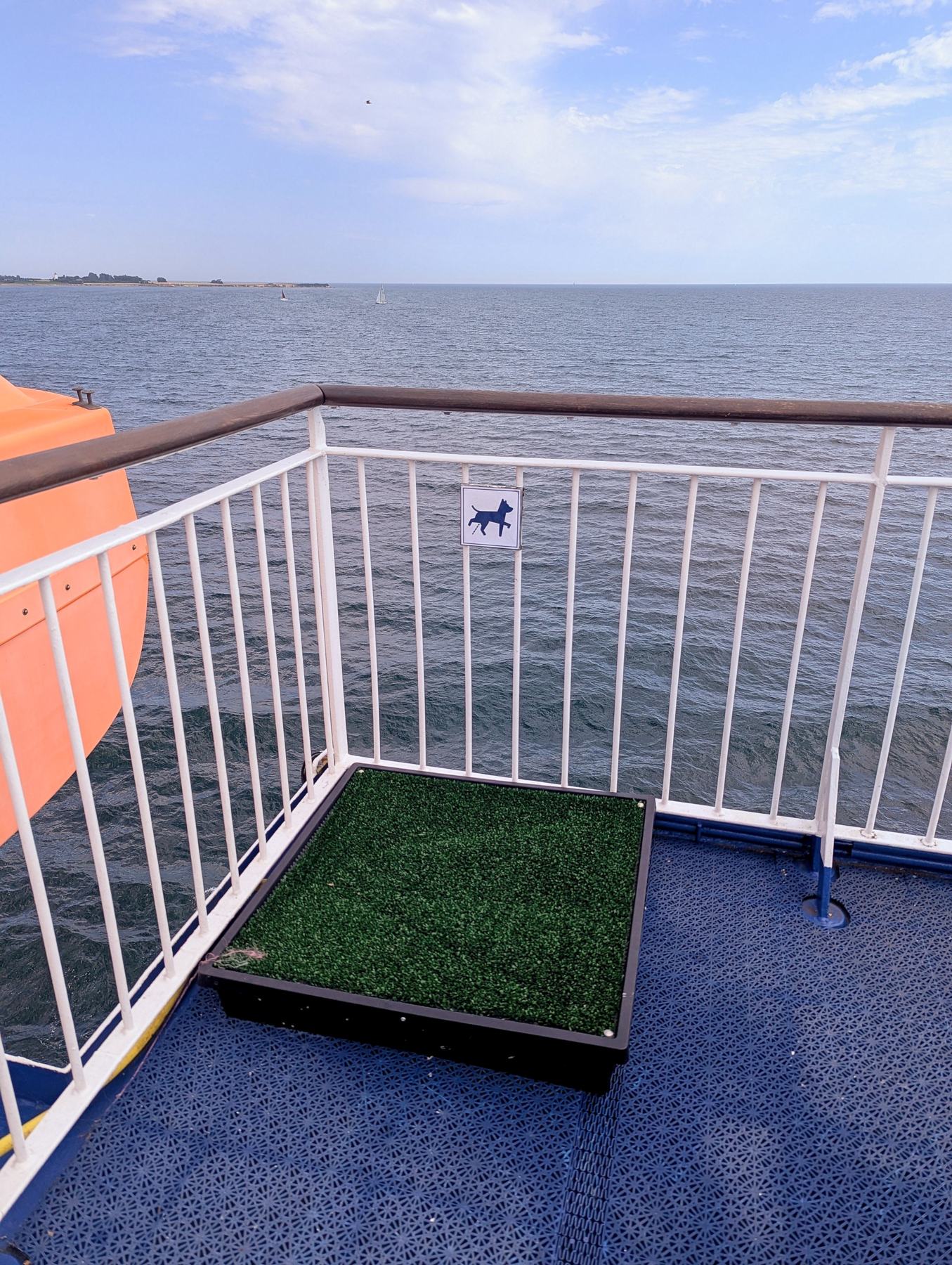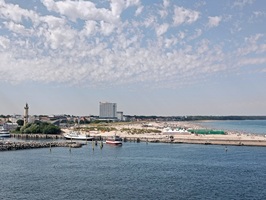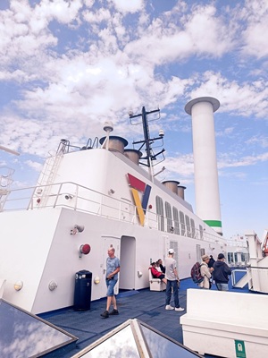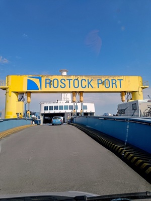 In Gedser konnten wir noch das WC entleeren (Wasser war zwar zum Auffüllen vorhanden, aber der Druck war zu gering), bevor wir zum Fährhafen fuhren. Pünktlich um 6:45 Uhr legte die Fähre ab. Die Überfahrt war ruhig, wir frühstückten mitgebrachtes Gebäck und gönnten uns teuren Kaffee, ehe wir nach etwa zwei Stunden in Rostock ankamen und das alte Hurtigruten-Schiff MS Nordstjernen am Kai sahen.
