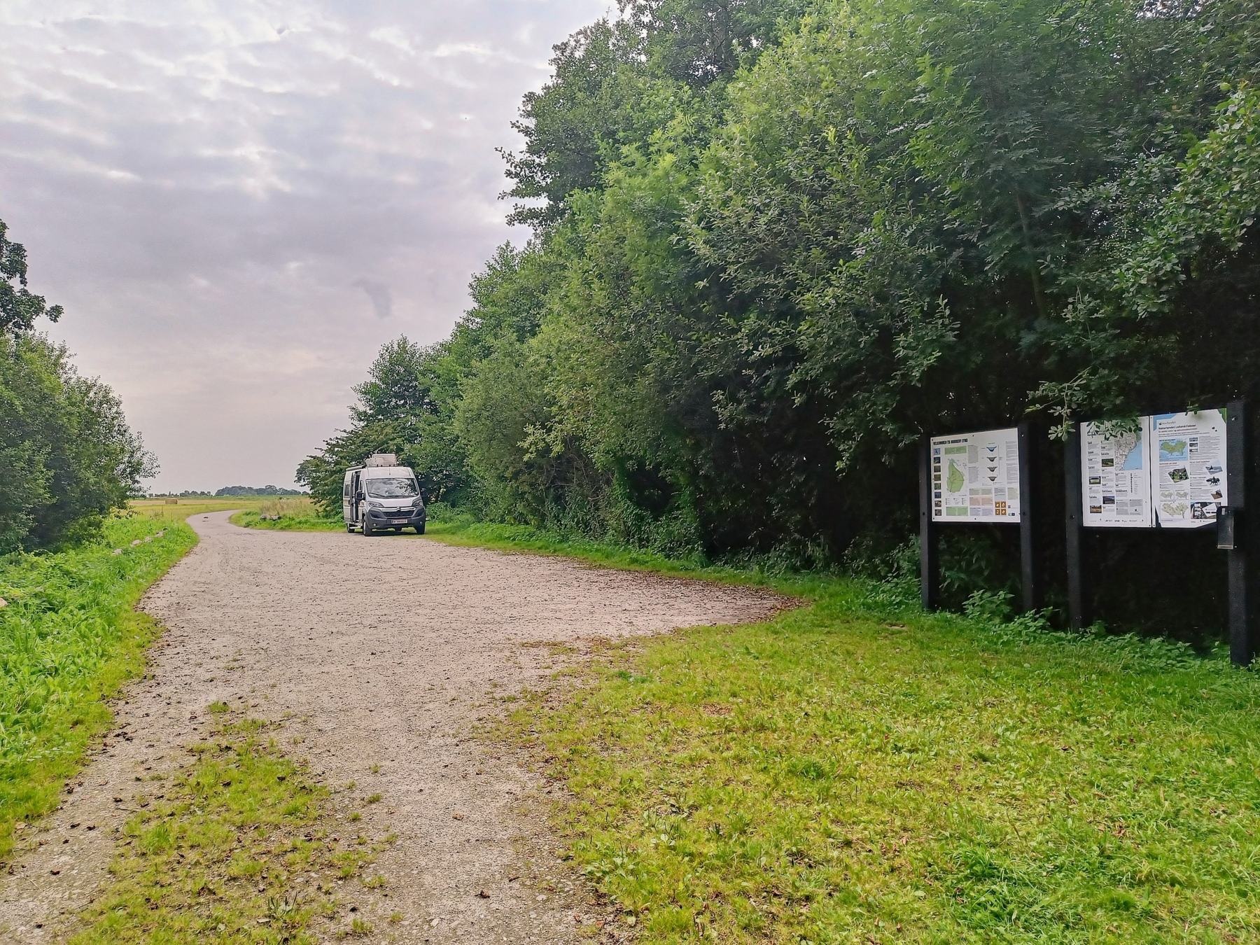 Obwohl der Parkplatz nur spärlich belegt war, stellte sich ein Camperkollege (Mietmobil!) direkt neben uns. Natürlich möchte niemand unnötig Plätze belegen, aber es wäre wünschenswert, wenn jeder beim Freistehen auf seine Privatsphäre achten würde. Es hätte ausgereicht, einige Parkplätze dazwischen frei zu lassen, auf denen auch Autos hätten parken können. So bekamen wir ungefragt die Gute-Nacht-Geschichte vom Nachbarn mit.