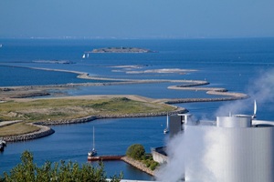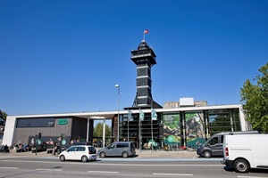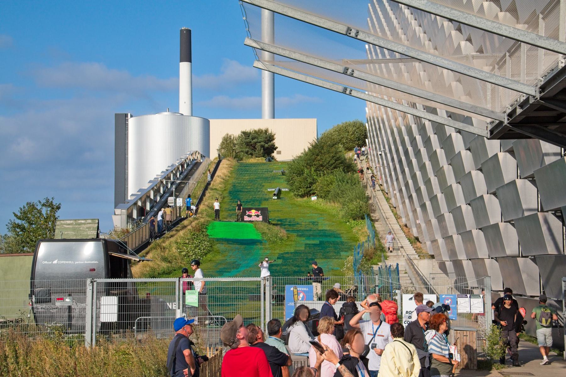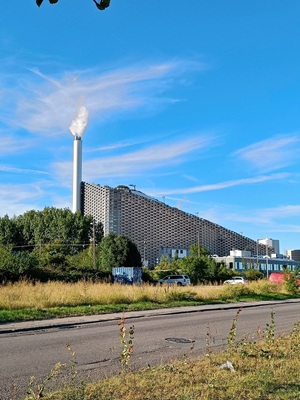 Mit den Rädern fuhren wir zur Müllverbrennungsanlage, wo wir den kostenlosen Lift zum Dach nahmen. Dort gaibt es einen Schilift und einen Klettersteig, der durchgehend von unten bis oben führt. Die Aussicht war großartig – das Zentrum von Kopenhagen war im Sonnenschein allerdings nicht gut zu sehen.